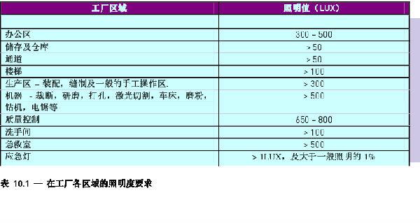 工廠的照明對(duì)員工的安全,生產(chǎn)力及產(chǎn)品質(zhì)量都可能產(chǎn)生影響。照明光亮度的需求因使用具體機(jī)器的不同以及員工工種的不同而有所不同。特定崗位(例如:縫紉)可能需要的光亮度比其他崗位高。通常來(lái)說(shuō),工廠必須提供足夠的照明以防止事故的發(fā)生,并且此要求與高質(zhì)量的生產(chǎn)要求相一致。工廠不同區(qū)域的照明的集體需求請(qǐng)參閱表10.1的建議。